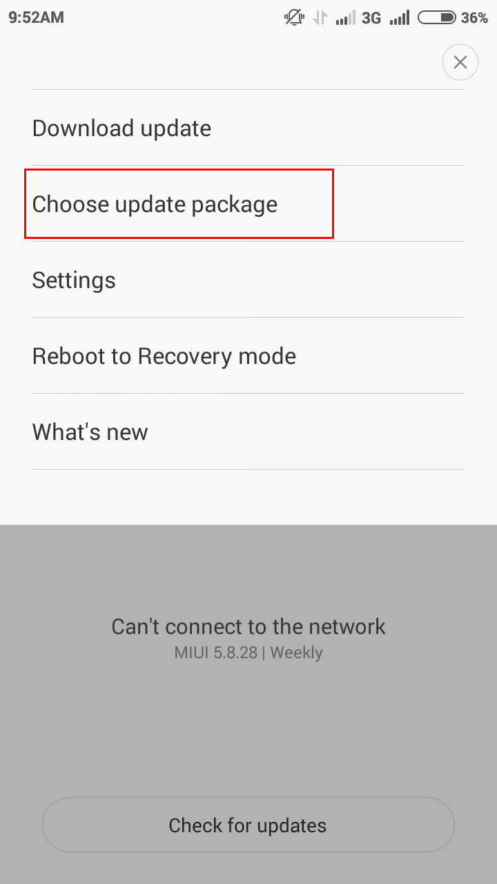 - Setelah itu Buka Updater, pilih Choose update package, lalu pilih update.zip yang sudah dicopykan ke internal card tadi.