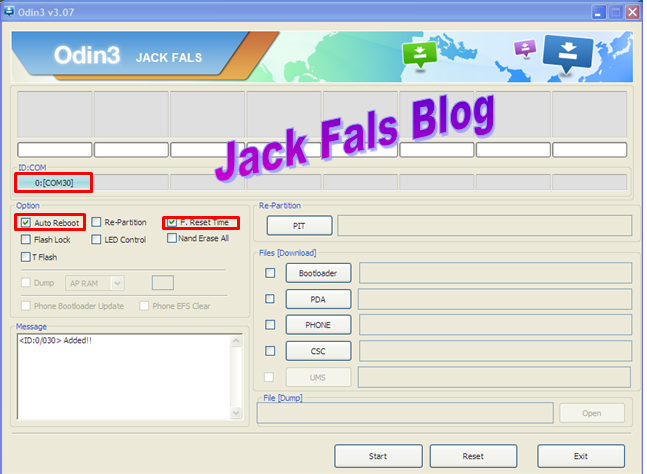 2-Jalankan Odin dan pastikan Kolom ID:COM pada odin Sudah berubah warna biru dan ada keterangan 0:[COM30] Perlu saya jelaskan sedikit,Keterangan ID:COM bisa saja berbeda di perangkat PC/Laptop sobat,Itu tergantung di COM mana hp sobat terdeteksi.0:[COM30] adalah keterangan pada perangkat komputer saya.Bisa saja di perangkat sobat terdeteksi 0:[COM1] atau 0:[COM5] dan sebagainya.Centang pada Auto Rebort dan F.Reset Time.